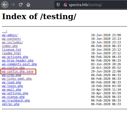 wget http://spectra.htb/testing/wp-config.php.save