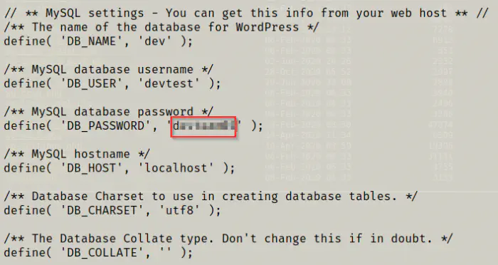 There is an interesting file that looks like the backup of the wp-config.php file. The original file contains the configuration of the wordpress file.