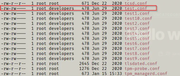 Also, since the user belongs to the group “developers”, she can write on the file.