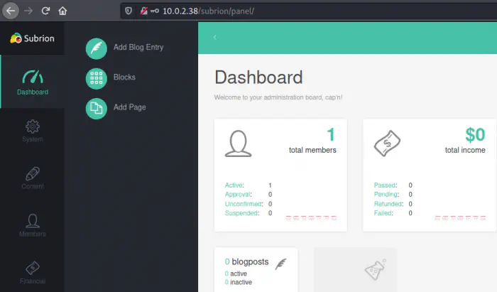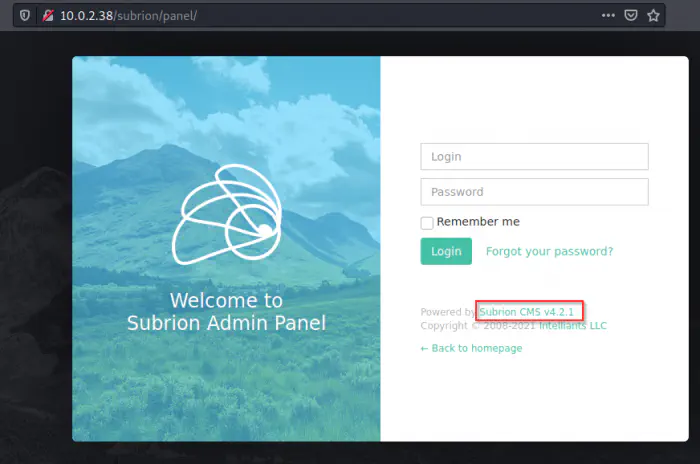 Now that I have got the credentials of the subrion panel, I could visit /subrion/panel directly. Also, the version of the CMS is 4.2.1 and it is vulnerable to authenticated file upload bypass vulnerability.