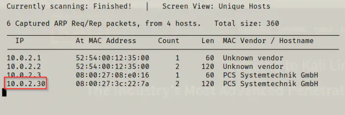 sudo netdiscover -i eth0 -r 10.0.2.0/24