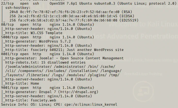 From the screenshot above, we can see that different CMS’ from wordpress, joomla and drupal are hosted on different ports. Hence, I decided to enumerate all of them. Also, from this result, we see that we have an older version of drupal. However, when I did the enumeration, I started with Wordpress. Also, when we surf the websites, we can see that the host is fsociety.web.