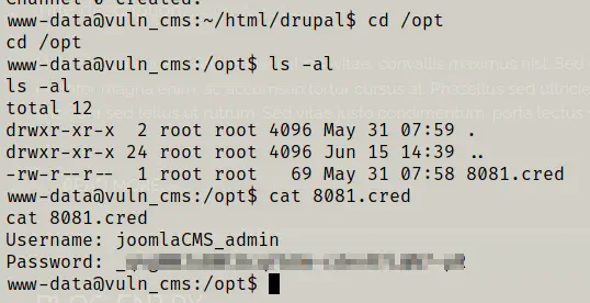 Since, we have got access to the machine, now we can search for database credentials. However, it’s not the ultimate way. There is a file in /opt directory, that revealed us the credentials of joomla cms.