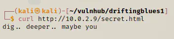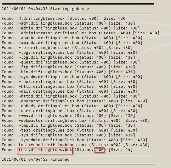 This means, we haven’t yet identified the secret location which seems to be some subdomain of driftingblues.box. We can enumerate virtual hosts using gobuster.