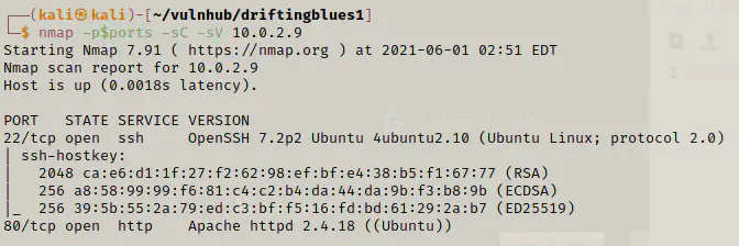 ports=$(nmap -p- --min-rate=1000 -T4 10.0.2.9 | grep ^[0-9] | cut -d '/' -f 1 | tr '\n' ',' | sed s/,$//)