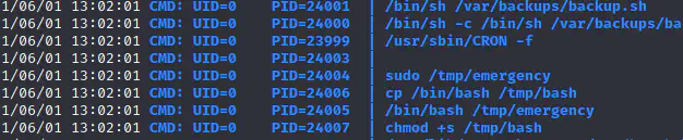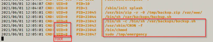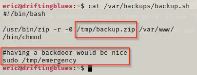 The backup.zip file which we saw earlier in the linpeas.sh enumeration is a result of this script. Also, the developer has included a backdoor in the script. Now, it’s easy to get another shell, or reverse shell, or we can add ssh entry, or we can also change the password of the root user. We have infinite possibilities. For this, we just have to update /tmp/emergency file and make it executable.