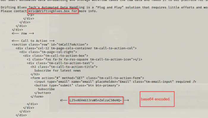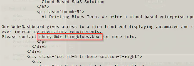 There is an email `sheryl@driftingblues.box. So, we might speculate that there is a user sheryl and the hostname of the server is driftingblues.box. We have to add that to hosts file. Meanwhile, let’s find some other information from the page.