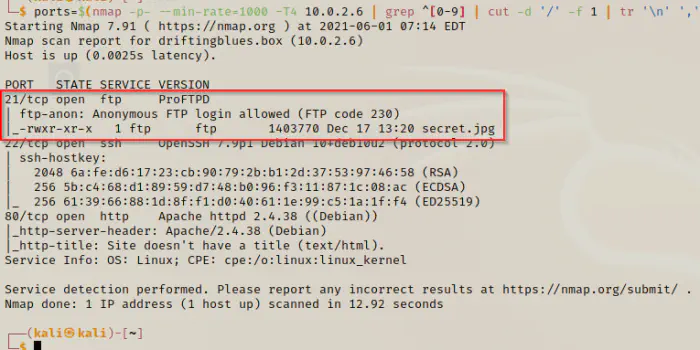 ports=$(nmap -p- --min-rate=1000 -T4 10.0.2.6 | grep ^[0-9] | cut -d '/' -f 1 | tr '\n' ',' | sed s/,$//) && nmap -p$ports -sC -sV 10.0.2.6