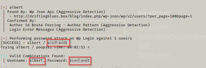 wpscan --url http://driftingblues.box/blog --detection-mode aggressive -e --passwords=/home/kali/rockyou.txt
