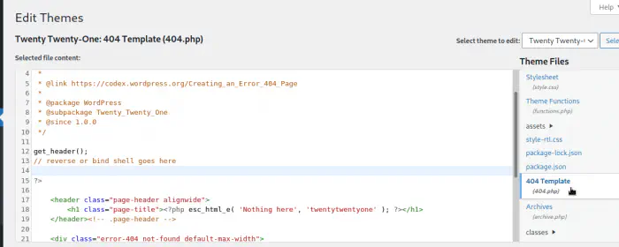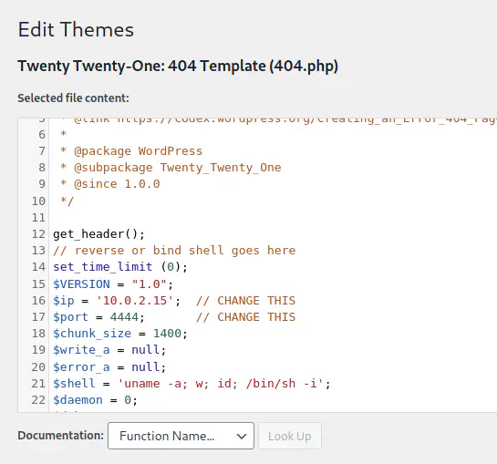 We can place the reverse shell in 404 template which is a perfect choice for me. You tell me, how often do you land at 404 page while using a website? Now, we will copy the PHP reverse shellcode, update the ip and port and paste it here.