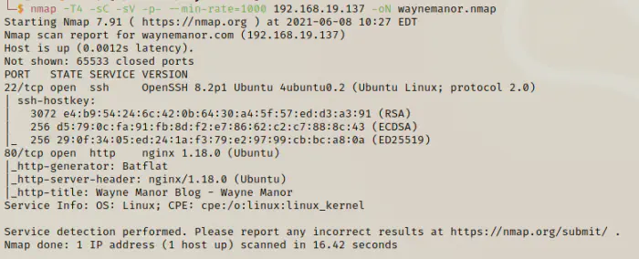 nmap -T4 -sC -sV -p- --min-rate=1000 192.168.19.137 -oN waynemanor.nmap