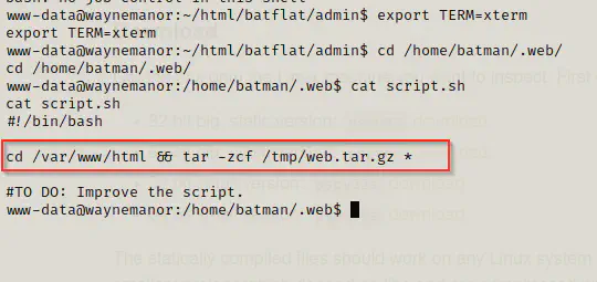 Here, the script changes the directory to /var/www/html and compresses all the files to a new file in /tmp/web.tar.gz. Hence, we have an opportunity to exploit it because we have access to write on the directory.