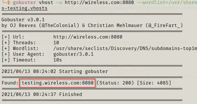 gobuster vhost -u http://wireless.com:8080 --wordlist=/usr/share/seclists/Discovery/DNS/subdomains-top1million-5000.txt -o wireless-testing.vhosts