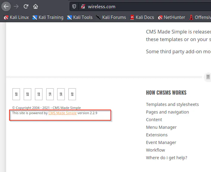 Meanwhile, on port 80, using the hostname led us to a CMSMadeSimple website now with version 2.2.9.