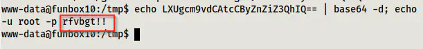 echo LXUgcm9vdCAtcCByZnZiZ3QhIQ== | base64 -d; echo