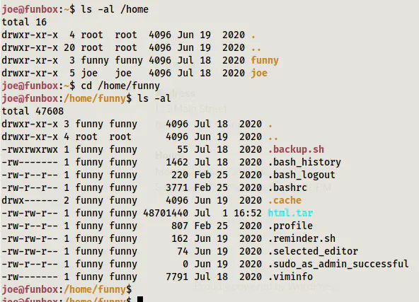 Although it had some pretty good information, it could also take us to a rabbit hole. There can be some possibilities of what this means. First is that three might be a cron job running for the backup script. Hence, we could exploit it to somehow gain access. Next, we could get credentials from the backup file. When I went to the directory of funny, I got the backup file and the backup script there.