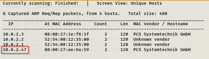sudo netdiscover -i eth0 -r 10.0.2.0/24