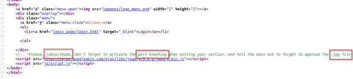 Here, we can get a possible username. Similarly, we also get to know that we require to unlock a port by using port knocking. Next, we get a hint that we have to do steganography as well. If this is the case, then we have to find the sequence of numbers that opens the port using the binary knockd. Therefore, let’s find these files. Also, we have to note the login.html right above the comment. Upon visiting the link, we get a login form.