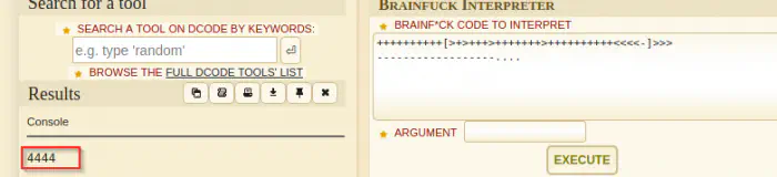 When we check /css path, we see a file 2.txt. This contained a text encoded in brainf*ck language. Next, we have to decode it using any online tools that give us another number.