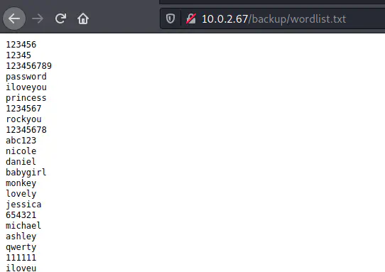 If you remember, we had a username before and now we have a service to log in to. But we lack a password. Then, when I checked /backup, I see a wordlist file there.