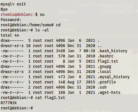 Now, I am going to tell you the unintended alternative way. There is a file .mysql_history on the user’s directory (/home/rtemis). And, if you open that you have all the mysql commands that the user had entered before submitting this machine. Hence, we can easily get the password of root from there as well and I am sure this isn’t the right way for this machine. This also tells us that in real-life machines, it’s always better to check the history files.