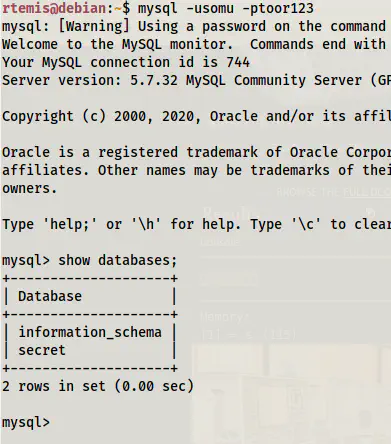We found the password for a mysql user somu. Now, we have two possibilities. Either we can try connecting to the server from our machine or from the target. When I tried connecting from my local machine like that follows, I can only see the database ‘information_schema’.
