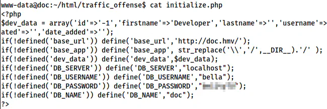 I checked for different files to get the credentials of the user. Fortunately, I found a file “initialize.php” inside the webapp’s directory. The file had database credentials that I could reuse for the user bella to get her shell.