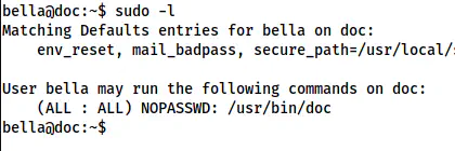 Now, here comes the interesting part. When I checked the sudo permissions, I found out that the user can execute a custom binary “doc” as the root user.