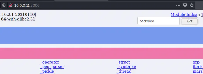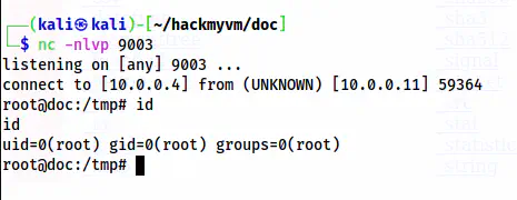 Here, I created a file backdoor.py that would give me a shell on port 9003 that I am already listening to. This is all pydoc requires. Pydoc checks for the scripts in the path and we have a script backdoor.py. Thus, I opened the doc server once again from the same shell.