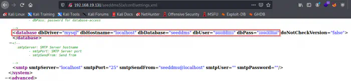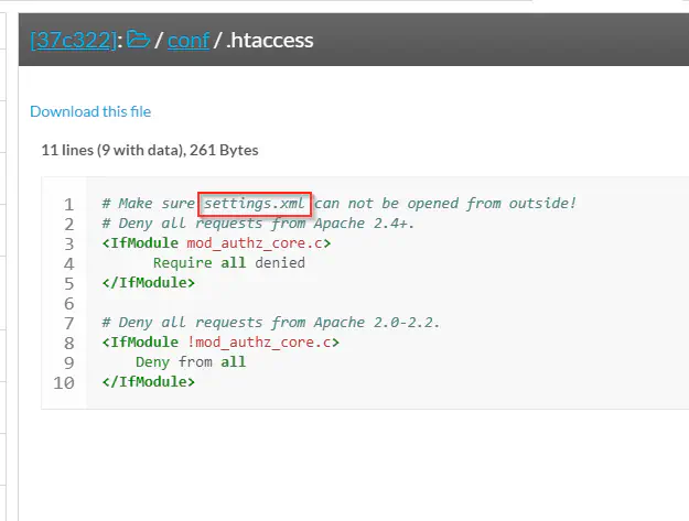 As in most frameworks, we see an example configuration file settings.xml.template. Furthermore, .htaccess reveals the actual settings file. Since the machine is a CTF challenge, we can assume that a misconfiguration in the .htaccess file would give us access to database credentials. Therefore, I directly visited the path on the target.