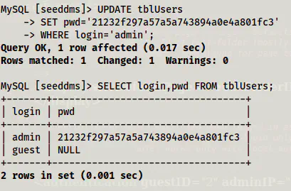 I used an online tool to generate the md5 hash of the word “admin” which is my new password.