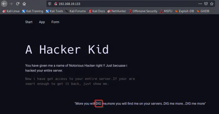On the homepage of the server, we see a hint that tells us to “Dig” more.