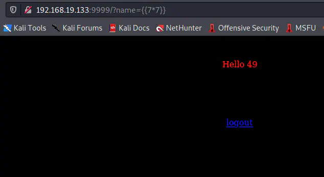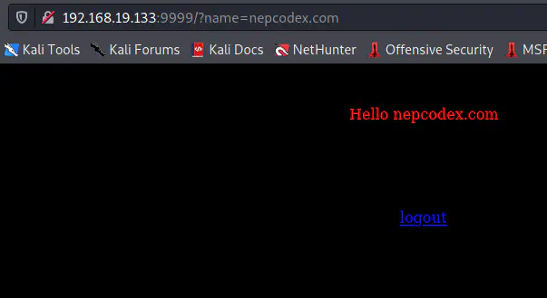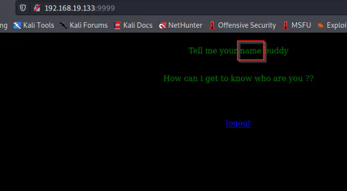 In our initial nmap scan, we saw that the server at port 9999 is running Tornado which is a python web technology. Similarly, we see that the page is asking for a name. So, we can guess that there is a GET parameter “name” where we can pass the value. Let’s try that.