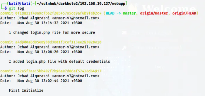 From the git logs, we see on the second commit the author has added the default credentials. So, let’s switch the HEAD to that commit.
