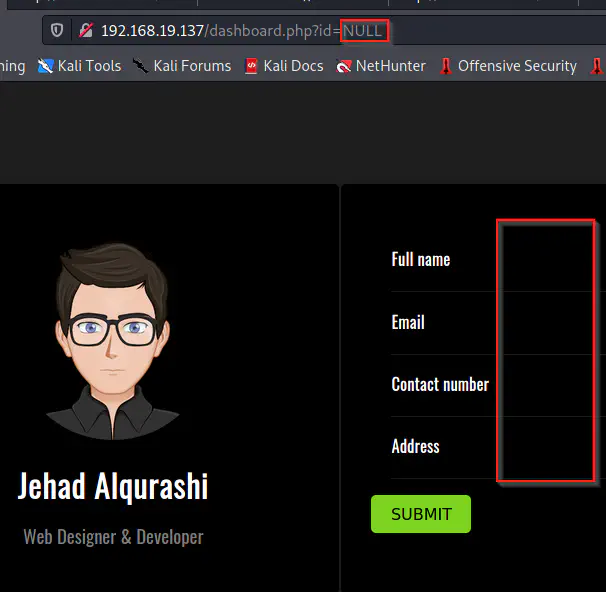The values disappear because of course there won’t be a user with an ID null. Hence, this gives us an idea that there are at least 5 columns on the table “users” including “id”. Let’s check if this suffers an SQL injection by replacing the value with a single quote.