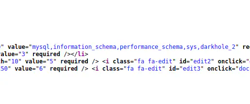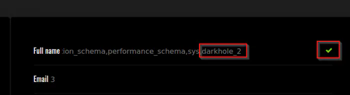 Here, we see that numbers 2,3,5 and 6 are reflected in the UI. This means that we can use columns 2,3,5 and 6 to dump data. Firstly, let’s identify the database names. However, we know the database of the machine from the config.php file in the source code. The database name is “darkhole_2”. But, let’s find out this way too.