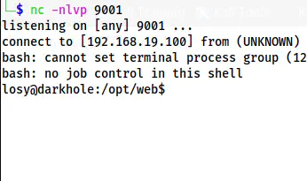 Now, we can get a reverse shell as the user losy. For that, I am listening on port 9001.