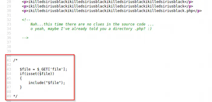 Luckily, there is a hint on the page source. Here, we have a possibility of a file inclusion vulnerability with the parameter “file”. So, let’s try to perform LFI in the script ikilledsiriusblack.php.