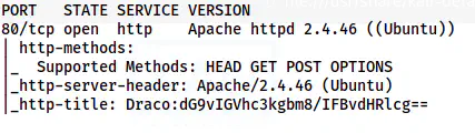Here, we have port 80 open on the target. Also, since there isn’t an SSH port open, we might have to perform remote code/command execution to get the reverse shell. Let’s decode the base64 code from the http-title.