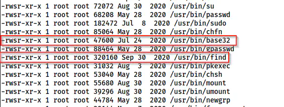 Luckily, we have two SUID binaries whose owner is the same user “root” that can give us a root shell. That is to say, find can give us a shell for the effective user root whereas base32 can give as privileged read access to the files.