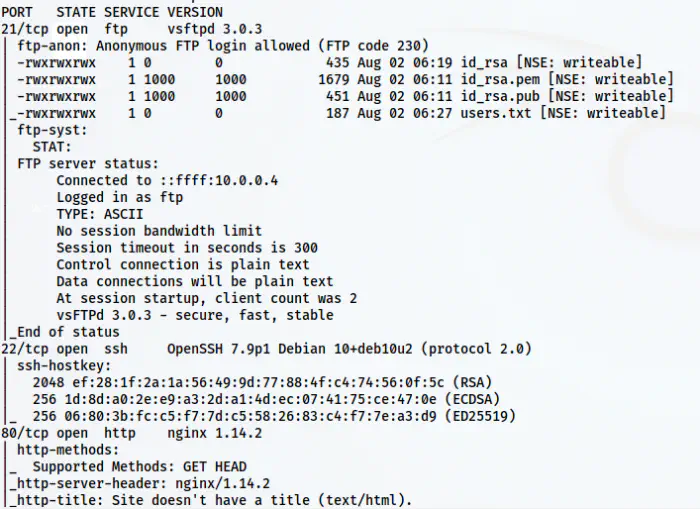 From the nmap scan results, we see that ports 21, 22 and 80 are open. Furthermore, we have anonymous access to the FTP server. Likewise, there are files that look like private keys. So, I logged into the FTP server anonymously and downloaded all the files.