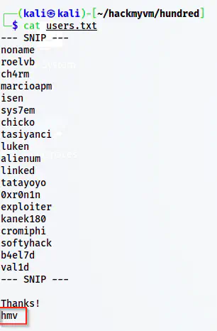 Similarly, on the users.txt file, we have some users from the HackMyVM platform. However, at the bottom of the file, there is a possible username as ‘hmv’.
