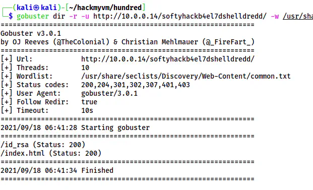 gobuster dir -r -u http://10.0.0.14/softyhackb4el7dshelldredd/ -w /usr/share/seclists/Discovery/Web-Content/common.txt -o dir-softyhack.log